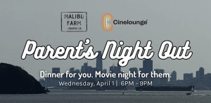 Get ready to enjoy a well-deserved night off without the kids! Malibu Farm Tiburon and Cinelounge Tiburon are teaming up to offer a special Parents’ Night Out event to kick start your Spring.