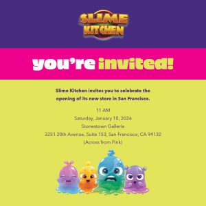 Celebrate the opening of Slime Kitchen’s new location in San Francisco, CA. Slime Kitchen offers an immersive slime-making experience where people of all ages can create personalized slime in a fun, hands-on environment. The first 50 attendees will receive a complimentary slime surprise!