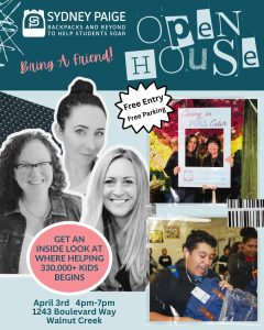 Come get a behind-the-scenes look at where helping 330,000 students (and counting) began! Sydney Paige Foundation, a 501 (c)(3), was set up to help get high-quality backpacks and school supplies into the hands of students who need them the most. We reject the notion that “something is better than nothing” and challenge our donors to the same! A backpack that lasts for 1 month is not worth the photo op if the student needs another a mere 30 days later. It is horrible for their confidence, and even worse for our environment! Please visit us on Friday, April 3rd, between 4-7 pm in Walnut Creek and check out our volunteer, donor, and partnership opportunities. We can’t wait to see you there!
